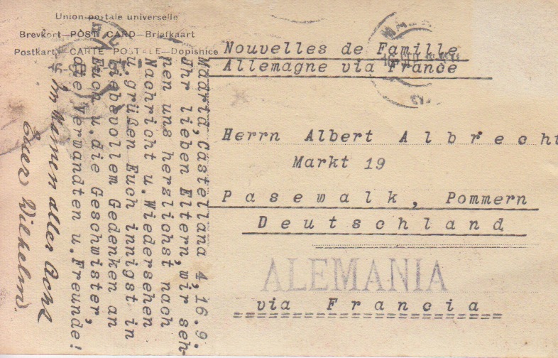Der Krieg war dann bitter für die Großeltern, zwei Kinder in Madrid. Die Post durfte nur wenige Worte enthalten und ging sehr langsam über Frankreich. Onkel Fritz geriet sehr bald in englische Gefangenschaft. Onkel Hans und Onkel Otto an der Front, Tante Johanna hatte kleine Kinder und die große Wirtschaft am Hals. Sie hatte russische Kriegsgefangene zur Hilfe. Sie erzählte mir , wie fleißig und sauber diese beiden Männer gearbeitet hätten, als ob es ihr eigenes gewesen wäre, und sie hat immer mit Achtung behandelt.