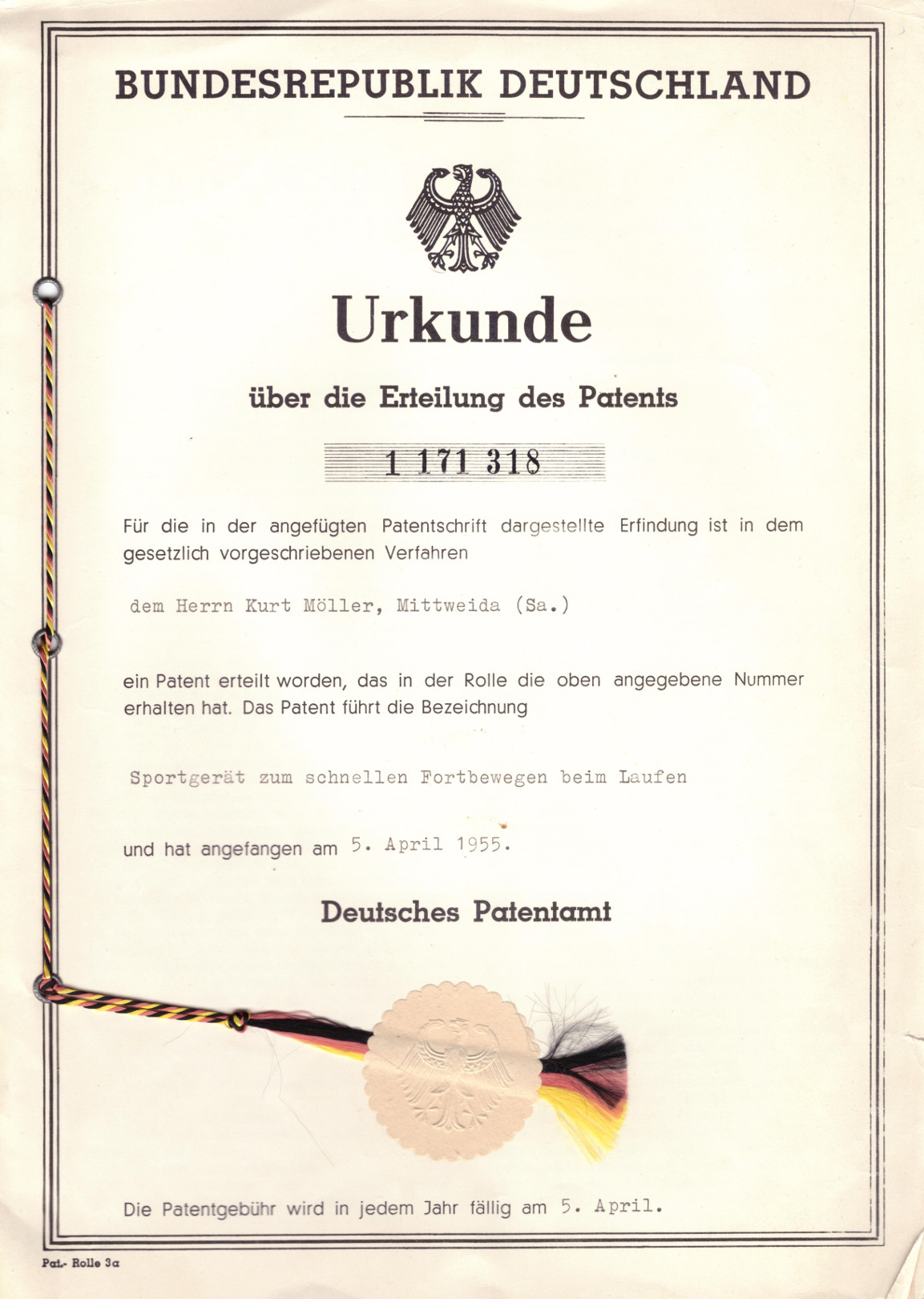 Als Kind hatte ich (Enkelin Sabine) davon gehört, es aber nie bewusst zu Gesicht bekommen: Das sagenhafte Patent zum Riesenschritte machen, das Sportgerät zum schnellen Fortbewegen beim Laufen. Im Internet konnte ich folgende Spur davon entdecken > Patent DE11713188. Enkel Theodor hat die Unterlagen von Kurts Erfindung zu unserer Erinnerung zur Verfügung gestellt. Dazu schreibt er … „Einige Geschichten, die ich zu diesem Sportgerät von meinem Vater (Sohn Friedrich) gehört habe: